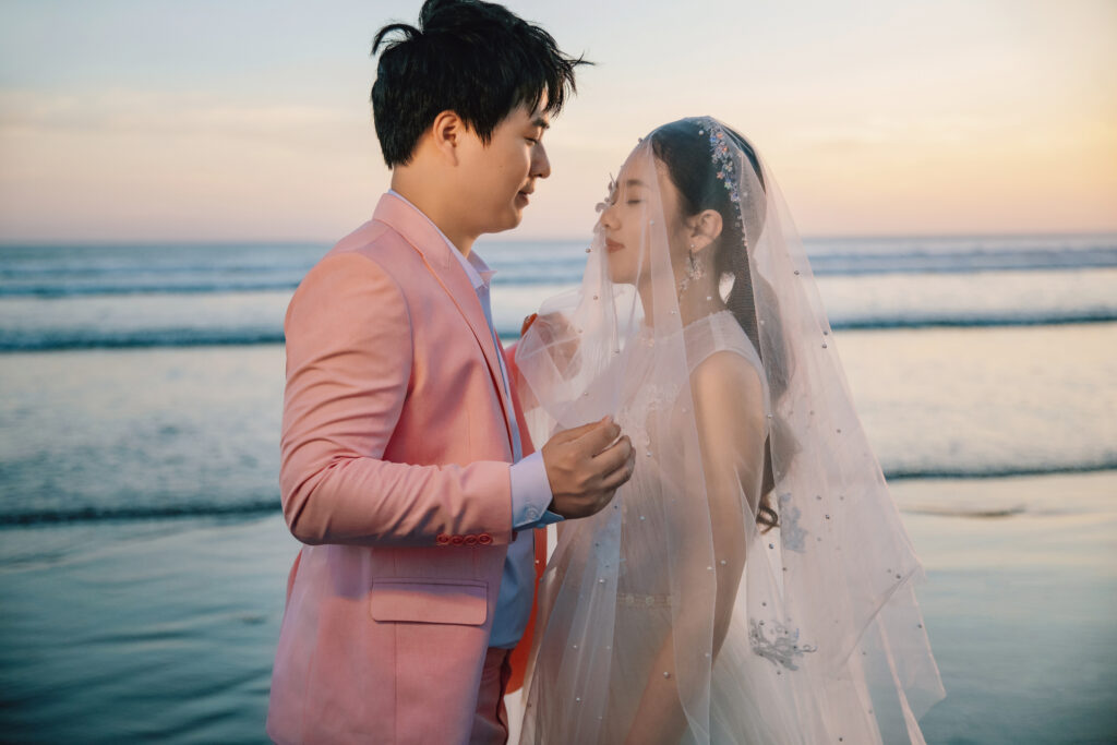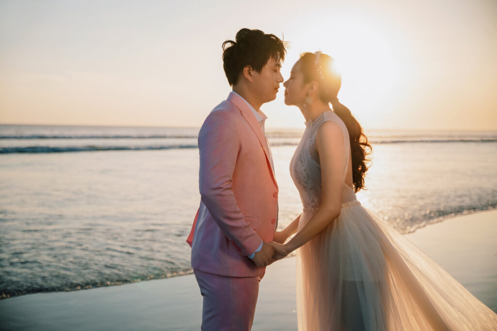 Shen Tuo and Zhu Yuchen, a young couple from Shanghai, chose Bali’s coastline to capture a warm, cinematic chapter of their love at day’s end. By focusing solely on the sea at sunset, they embraced gentle light, open horizons, and the quiet calm that helps couples connect naturally. Their gallery feels honest and intimate proof that golden hour can lead the storytelling with minimal direction.